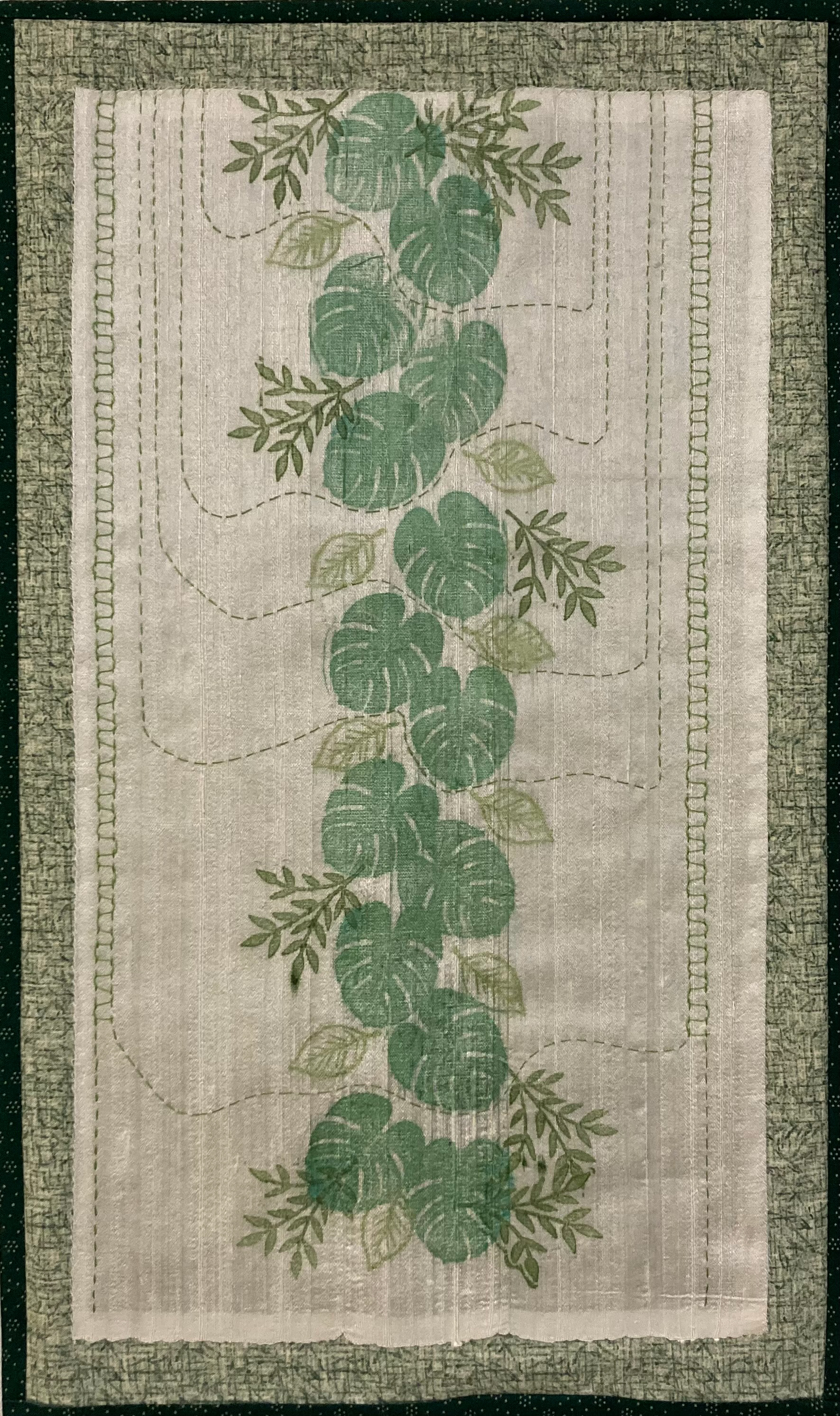 Technical challenges: This project was inspired by the ink-stamped pieces in the Ruth Asawa exhibit at SF MOMA, though I bought my stamps at a store instead of making them out of potatoes. The silk background absorbed the ink nicely but frayed so fast that it nearly took the top edge and side embroidery with it, so I had to abandon my original finishing plan and hand-sew it to the background fabric. The lower edges of both the silk and its cotton background are floating rather than stitched. This was intentional for the silk, accidental for the cotton (seam allowance turned out to be too small). Borders are wrapped around to the reverse side and mitered into place.